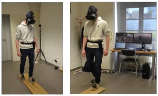 A computer (equipped with a processor Intel Xeon E5-1360 v4 and a graphic card NVIDIA GeForce GTX 1060) was connected to the HTC Vive CV1 system composed of a helmet, two Vive controllers, and two Vive Trackers attached to the feet of the participants whose position and orientation were detected via infrared by two base stations in a space of 4 m × 3 m × 2.5 m (Figure 3). Steam VR and Xsplit software were used to run the environment and to visualize and record the user’s behavior. A second screen was used by the experimenter to follow what was happening in the VR environment from the participant’s point of view.
