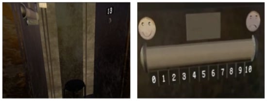 Screenshot of the elevator in the virtual environment (image on the left), including a stool at the bottom of the elevator, the SUD scale on the wall on the left of the image and a button to go to the upper floors on the wall on the right of the image. The detail of the gauge, representing the SUD score from 0 to 10, is on the right of the image.