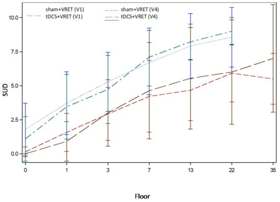 For the whole sample, we observed a significant effect of the height on the SUD scores with a mean increase per floor of 0.31 (95% CI: 0.27, 0.36; p < 0.0001). Between-group comparisons did not demonstrate a significant effect of active versus sham stimulations on SUD scores at each floor within VR sessions, including comparison between the first (V1) and the last (V4) session (Figure 7). At V4, there were no significant differences between groups in all variables, as shown in Table 3. However, there was a significant decrease in SUD scores with regard to mean individual changes between V1 and V4 (mean V1 = 8.44 (95% CI: 7.64, 9.24); mean V4 = 6.36 (95% CI: 5.16, 7.56)) in the whole sample (Wilcoxon test, p = 0.0002).