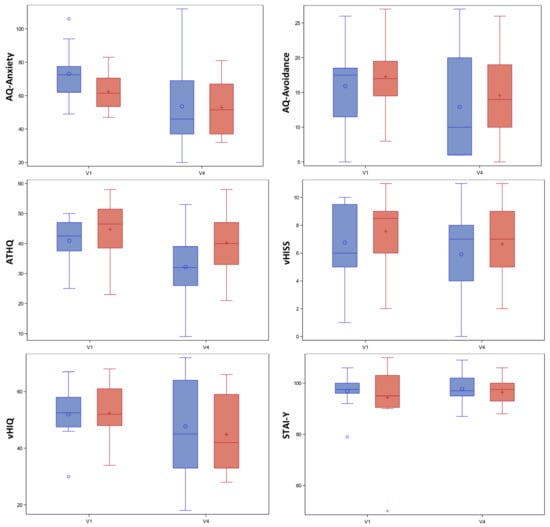 Boxplots of clinical scale scores between V1 and V4. In blue, the tDCS + VRET group (n = 11) and in red, the sham + VRET group (n = 14). Abbreviations: AQ: Acrophobia Questionnaire; ATHQ: Attitude Towards Heights Questionnaire; STAI: State-Trait Anxiety; vHISS: visual Height Intolerance Severity Scale; vHIQ: visual Height Intolerance Questionnaire; VRET: Virtual Reality Exposure Therapy.