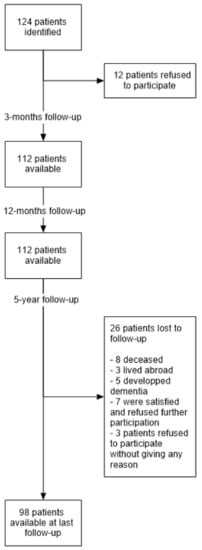 Of the identified patients, 112 patients (90.3%) with 120 hip arthroplasties were available for the three-month and the 12-month follow-up (Figure 1). Ninety-eight patients (79%) with 98 hip arthroplasties were available for all follow-up examinations including the five-year follow-up. Twenty-six patients (21%) were lost to follow-up: eight patients died (7.1%) (none of them died of a hip-related reason), three patients lived abroad, five patients developed dementia (none of them had a revision of the hip prothesis) and 10 patients refused participation in this study (seven of them were satisfied with the results and three refused to participate without giving any reason).