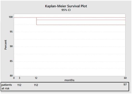 No other complications were reported. The stem survival rate at five years after surgery calculated according to Kaplan-Meier Method [] and considering revision for any reason as an endpoint was 99.15% (CI 95%: 97.7–100%) (Figure 2).