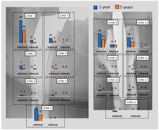 Minimal and relevant radiolucencies at 12 months and five-year follow-up according to the Gruen zones classification [].