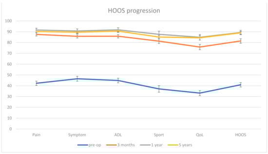 Progression of the HOOS score. The error bars represent the standard error at 95%.