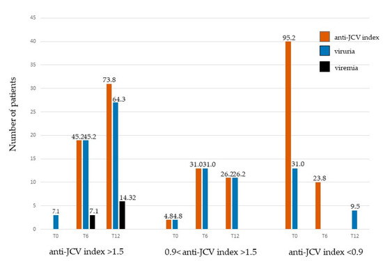 Relationship between serostatus and JCPyV DNA in 42 individuals with MS. T0: before starting treatments, no drug administration; T6: 6 months after the beginning of therapy; T12: 12 months after the beginning of therapy. The number on top of each bar indicates the percentage of MS persons with anti-JCV index, viruria and viremia, respectively. The absence of a bar indicates that none of the individuals with MS had the indicated anti-JCV index, viruria and viremia, respectively.