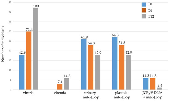 As described above, at T0, JCPyV DNA was found in 18/42 urine samples belonging to MS patients. Analyzing the miRNA expression, miR-J1-5p was detected in 26/42 urine and in 27/42 plasma samples. Concomitant presence of JCPyV DNA and miR-J1-5p expression showed that of the 18/42 patients with viruria only 6 patients expressed miR-J1-5p. After 6 months’ treatment (T6), JCPyV DNA was detected in 30/42 urine samples and in 3/42 plasma samples (Figure 2). Inverse to the increase in the number of patients who tested positive for viral DNA, the number of patients in which the expression of miR-J1-5p was revealed in urine decreased from 26 (T0) to 23 (T6), and in plasma from 27 (T0) to 23 (T6). Among these, JC viruria and viremia were simultaneously detected, with miR-J1-5p expression in five patients and in one patient, respectively (Figure 2). At T12, a reverse trend was established: JCPyV DNA was detected in all urine specimens and in 6/42 plasma samples (Figure 2), whereas the number of miR-J1-5p-positive samples showed a further decrease (from 23 to 18, both for urine and plasma). JCPyV DNA, in addition to miR-J1-5p expression, was confirmed in the same one viremic patient observed at T6 (Figure 2).