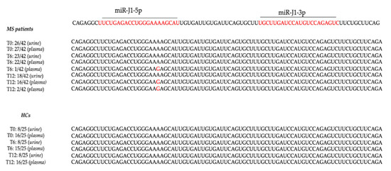 The miR-J1-5p mutations observed in JCPyV-DNA-positive MS specimens and in HCs. The mature miR-J1-3p and -5p are indicated (red color) by the bar over the sequence. The target region is indicated under the sequence. The JCV-miR-J1 sequence from miRBase V20 was used as a reference sequence [28]. MS patients: multiple sclerosis patients. HCs: healthy control subjects. T0: before starting treatments, no drugs administrated; T6: 6 months after the beginning of therapy; T12: 12 months after the beginning of therapy. The miR-J1-5p miRNA was investigated in each sample obtained from 42 MS patients. The positive samples, in which miR-J1-5p sequence was detected, are reported: at T0, miR-J1-5p was detected in 26/42 urine samples (62%) and in 27/42 (64%) samples. All analyzed samples presented a sequence identical to the miRBase V20 reference sequence [28]. At T6, miR-J1-5p was detected in 23/42 (55%) urine and in 23/42 (55%) plasma samples. A total of 23 urine and 22 plasma samples presented a sequence identical to the reference strain [28], whereas 1 plasma sample belonging to a MS patient treated with natalizumab displayed the transition A to G. At T12, miR-J1-5p was detected both in urine and in plasma from 18/42 patients (43%), and except for two plasma samples belonging to natalizumab-treated patients in which the transition A to G was observed, all sequences were identical to the reference strain [28]. Throughout the study (T0, T6 and T12), the detection of miR-J1-5p was also performed on urine and plasma samples of the HCs population. At T0, miR-J1-5p was detected in urine from 8/25 (32%) and in plasma from 16/25 (64%) HCs. At T6, the number of urine samples in which miR-J1-5p was detected remained the same as observed at T0 (8/25), whereas the number of miR-J1-5p-positive plasma samples decreased from 16 to 15. At T12, the number of urine and plasma in which miR-J1-5p was revealed was the same as the number observed at T0 (8/25 urine; 16/25 plasma).