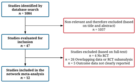 - Hutton, B.; Salanti, G.; Caldwell, D.M.; Chaimani, A.; Schmid, C.H.; Cameron, C.; Ioannidis, J.P.A.; Straus, S.; Thorlund, K.; Jansen, J.P.; et al. The PRISMA Extension Statement for Reporting of Systematic Reviews Incorporating Network Meta-analyses of Health Care Interventions: Checklist and Explanations. Ann. Intern. Med. 2015, 162, 777–784. [Google Scholar] [CrossRef] [Green Version]