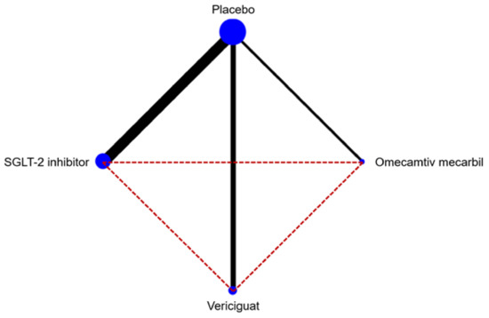 Treatment effects were compared with an NMA technique to provide more precise effect estimates, combining both direct and indirect evidence. In addition, this allowed for the comparison of pairs of interventions that were not directly assessed in randomized trials. This comprehensive comparison of all interventions in a single analysis also provided an estimation of their relative efficacy ranking for a given outcome [13,14,15]. This technique is extensively described in the Cochrane Handbook for Systematic Reviews of Interventions [15]. The present NMA included RCTs comparing the study drugs (SGLT2i, vericiguat, or omecamtiv mecarbil) with the placebo on top of standard-of-care therapy for HFrEF, thus obtaining indirect comparisons of the relative efficacy of the investigated study drugs [16,17]. The transitivity of the included studies was checked by a qualitative comparison of the baseline patient characteristics. A random-effects NMA was performed on the cumulative event rates for primary and secondary endpoints based on a frequentist approach with the DerSimonian−Laird estimator [18]. Effect estimates were based on relative risk (RR) per study, and were analyzed by considering their point estimates and 95% confidence interval (CI). The NMA results were summarized by means of league tables. No locally closed loop to calculate both the direct and indirect evidence exists to evaluate inconsistency.
