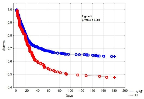 Kaplan–Meier curve showing 180 days survival stratified for patients with and without AT.