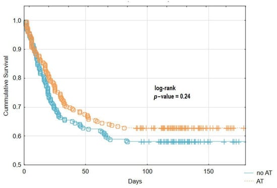 Regarding the primary outcome of the study, 38.5% of AT patients after PSM died during the 180 days follow-up. This was comparable to the 41.1% rate of death among no AT patients after PSM (p = 0.51). Kaplan–Meier analysis (log-rank test) also demonstrated similar survival in both groups of patients until the 180th day from admission to hospital (Figure 2).