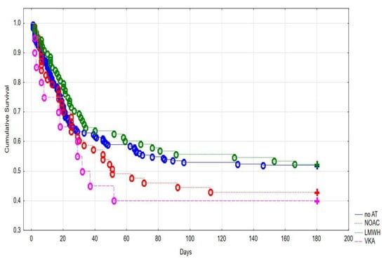 Heparins (unfractionated heparin, UFH and LMWH) are well-known anticoagulants with proven anti-inflammatory activity. They reduce endothelial cell damage and inhibit adhesion of leukocytes to endothelium. What is more, heparin effect on IL-6 and IL-8 reduction has been demonstrated [,]. Recently, the role of heparin in reducing SARS-CoV-2 infectivity has been postulated. In vitro studies revealed a high binding affinity of heparin to the spike protein of SARS-CoV-2. As a result, heparin can directly inhibit spike protein binding to the ACE2 receptor [,]. While there is a strong pharmacologic rationale for heparins in treating SARS-CoV-2 infection, pre-hospital use of LMWH has not increased the middle-term survival of patients with COVID-19 in our study. However, it should be noted that the mortality rate noted in this group was similar to no AT patients and tended to be lower when compared to patients on VKAs or DOACs.