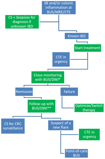 Proposed flowchart for the use of cross-sectional imaging techniques for monitoring of inflammatory bowel disease (IBD). * Every three months for active disease. ** Every six to twelve months in clinical and biochemical remission. BUS, bowel ultrasound; MRE, magnetic resonance enterography; CTE, computed tomography enterography; CS, colonoscopy; DWI, diffusion weighted imaging; CRC, colorectal cancer.