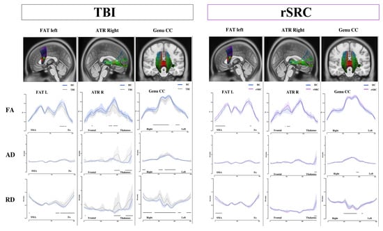 Focal along-tract analysis was performed using multiple unpaired t-tests comparing each white matter pathway index in TBI vs. HC and rSRC vs. HC for all DTI-based parameters and white matter pathways, respectively. The false discovery rate (FDR) was controlled using the Benjamini–Hochberg procedure with Q = 10%. In this regard, the number of false positives is kept below 10% of the number of significant indices. We chose a group of ten sequential significant indices to indicate a significant difference compared to HCs.
