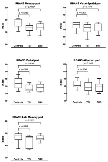 Both TBI patients and rSRC athletes were impaired on the RBANS global outcome analysis compared with HC (TBI: 75 ± 24; rSRC: 80 ± 17; HC: 105.5 ± 2; TBI to HC: p = 0.03 rSRC to HC: p = 0.006). RBANS Memory scores were lower in both TBI, and SRC when compared to HC (p = 0.048 and p = 0.04; respectively). The RBANS Verbal scores were lower in rSRC athletes compared to HC (p = 0.048) although not in TBI (p = 0.07). No significative difference was detected among the groups for the other RBANS functional domains (Figure 2).