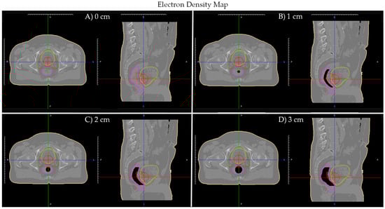 Patient A’s planning CT electron density maps with artificial tubular air cavities of diameter: (A) 0 cm; (B) 1 cm; (C) 2 cm; and (D) 3 cm. Planning CT contours displayed: Red—planning target volume (PTV); Green—clinical target volume (CTV); Yellow—bladder; Pink—rectum/rectal wall; Red cross—isocenter.