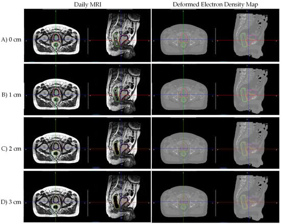 Patient B’s daily MRI with artificial tubular air cavities of diameter (A) 0 cm, (B) 1 cm, (C) 2 cm, and (D) 3 cm, and corresponding electron density map from deformable registration with simulation CT. Notably, deformed electron density maps were unable to recreate daily MRI air cavities, resulting in inaccurate daily MRI electron density maps. Daily MRI contours displayed: Pink—bladder; Orange—PTV; Green—rectum/rectal wall.