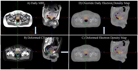Patient 3 Fraction A’s (A) daily MRI, (B) corresponding deformed simulation CT, (C) deformed planning electron density map (‘Deformed’) and (D) corrected daily air cavity electron density map (‘Override’). Daily MRI and deformed simulation CT display significantly different air cavities. White arrows indicate workflow for obtaining daily air cavity corrected electron density map. After daily air cavity correction, the ‘Override’ electron density map more accurately represents the daily MRI’s electron density. Daily MRI contours displayed: Pink—bladder; Orange—PTV; Green—rectum/rectal Wall; Red—daily MRI air cavity; Yellow cross—isocenter. Simulation CT contour displayed: Blue—simulation CT air cavity.