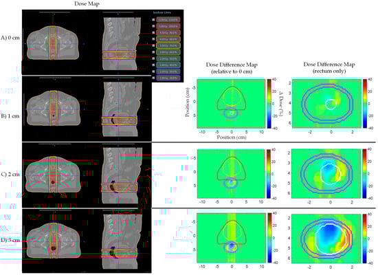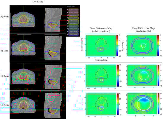Prostate bed Patient A’s AP plan dose maps (overlaid on planning CT electron density map) and dose difference (ΔDose (%)) maps for (A) 0, (B) 1, (C) 2, and (D) 3 cm artificial planning CT air cavity Rectum dose difference maps show hot and cold spots within the rectum increased in magnitude and size with increasing air cavity size due to the electron return effect (ERE). Dose difference map planning CT contours displayed: Red—PTV; Yellow—bladder; Pink—rectum; White—artificial air cavity.