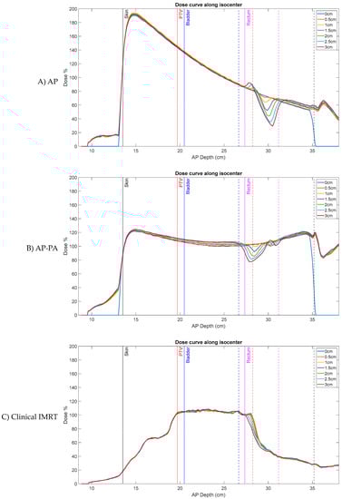 Prostate bed Patient A’s AP dose-depth curve, along the isocenter, for varying air cavity sizes with (A) AP, (B) AP–PA, and (C) clinical IMRT plans (normalized by respective plan’s prescribed PTV dose). Clinical IMRT dose is more robust to air cavity sizes than AP and AP–PA plans and shows little deviation. Solid lines—planning CT target/organ start, dashed lines—planning CT target/organ end.