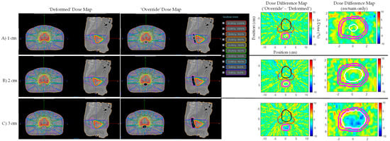 Prostate bed Patient B’s ‘Deformed’ and ‘Override’ plan dose and dose difference maps for (A) 1, (B) 2, and (C) 3 cm artificial daily MRI air cavities. Target/organ mean and max dose difference was relatively small (<4%) despite air cavity correction in the ‘Override’ plan. Dose difference map daily MRI contours displayed: Red—PTV, Black—bladder, Pink—rectum, White—artificial air cavity.