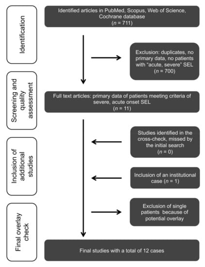 Based on the selected studies, we extracted and summarized all available data from previously reported SEL patients with acute onset of severe symptoms. The patient cohort was additionally screened by TFD to exclude potential double-listed cases. The quality of the studies was addressed by OG and RJ using an adapted quality assessment score (QAS) (Table S1), which has been described in detail previously []. All information was extracted from case reports reducing the points given for “minimizing selection bias “to a minimum of 2 points (e.g., prospective, consecutive studies would have received a maximum of 8 points).