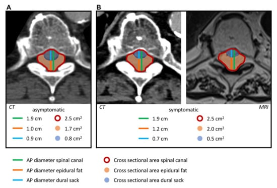 According to Borré et al., anterior-posterior diameter ratios of epidural fat (EF) to the dural sack (DuS) and the spinal canal (SpiC) were calculated using Centricity™ Universal viewer (GE, Healthcare, North Richland Hills, TX, USA) []. Likewise, cross-section area ratios for EF vs. DuS and SpiC were calculated (see Equations (1)–(4) and Figure 2). For all ratio calculations, only axial planes of maximum compression level were used.