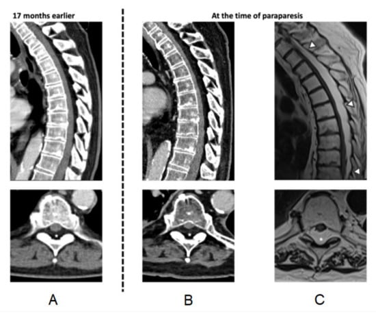 - Oikonomou, A.; Birbilis, T.; Gymnopoulou, E.; Prassopoulos, P. Paget disease of the spine manifested by thoracic and lumbar epidural lipomatosis. Spine 2007, 32, E789–E792. [Google Scholar] [CrossRef]