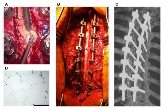 Intraoperative and postoperative images. (A) Intraoperative view of the microsurgical tumor removal. A section of SEL (yellowish mass) is lifted with an aspirator and a microsurgical punch from dura (marked with *). (B) Overview of the operation field at the end of tumor removal and spinal fixation, illustrating the extensions of the procedure. (C) Maximum intensity projection image of the postoperative CT scan. (D) H and E stained tumor slice after histopathological preparation, allowing the diagnosis of SEL with benign hypertrophic, unencapsulated fat cells (Bar represents 100 µm).