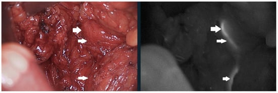 Ureters are structures which colorectal surgeons should be aware of during surgical resection. Iatrogenic injury of the ureter is not common, but it does lead to serious complications. In gynaecologic operations, the rate of injury might be as high as 1.5% of cases []. Visualisation of this structure is of great importance, especially in re-operations or after radiotherapy. Some preliminary reports about using light ureter catheters are available; however, this requires an additional invasive procedure, and may increase the risk of complications []. The first description of near-infrared fluorescence visualisation of ureters was proposed by Verbeek et al., where, in their study of a group of 12 patients, both ureters were seen after intravenous injection of MB []. The authors used three different doses of MB (0.25 mg/kg, 0.5 mg/kg, and 1 mg/kg), and the difference was only seen at the time of exposure. The other publication on this topic is based on 10 patients by Al Taher et al., who visualised both ureters of 5 of the patients under fluorescence []. In a study based on a much larger group of patients, Barnes et al. identified 64 out of 69 ureters during colorectal surgery in 40 patients []. Since 14 ureters were not seen in visible light, the help of fluorescence made an impact in this group of patients. Additionally, 50 ureters were seen under visible, as well as fluorescent, light, but 14 of them were recognised more quickly using near-infrared visualisation. The authors highlighted that in 14.5% of cases, the ureter was identified in a different localisation than expected. They also used different concentrations of methylene blue (0.25 mg/kg, 0.5 mg/kg, 0.75 mg/kg, and 1 mg/kg). The highest mean SBR was seen using the 0.75 mg/kg dose (mean = 5.29, SD = 2.72, 95% CI 4.84–5.75), and the lowest when using 1 mg/kg (mean = 3.66, SD = 1.89, 95% CI 3.37–3.39). Contrary results were published by Yeung et al., whereby a concentration of 1 mg/kg gave the strongest signal []. We should underline the fact that not only MB, but also other dyes, are used for visualising ureters, such as ICG. After retrograde injection to the ureter through ureteral catheters after ICG injection, an immediate visualisation is possible [,,]. In a group of 30 pelvic surgeries, Mandorva et al. observed the fluorescence of ureters in all cases, and the fluorescence was visible until the end of the longest operation (about 4 h). In 33% of patients, the fluorescent light helped in the localisation of ureters prior to naked-eye inspection. Additionally, two other experimental dyes are available: IRDye 800BK and cRGD-ZW800-1. Both are being investigated in ongoing trials (trial numbers 2017-001954-32 and NCT03387410). In a review by Slooter et al., another six dyes (CW 800-CA, Fluorescein, Liposomal ICG, Genhance 750, UL-766, Ureter Glow) were considered to be valuable options for ureter visualisation; however, only preliminary results are available []. In our study, we visualised the ureter in 91.6% of cases, and our retrospective analysis showed that injury of the ureter was very rare, although still possible. In difficult cases, it seems that the help of fluorescent visualisation may be of great importance, especially in difficult cases, and during the training of young surgeons.