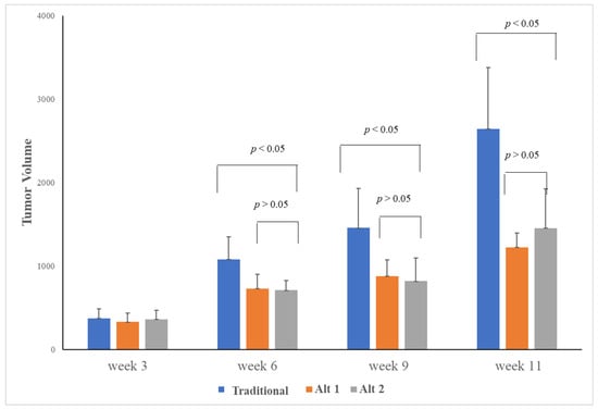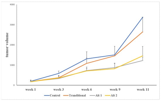 The differences in tumor sizes between groups were tested using the t-test (two sample assuming unequal variance). The compared groups were control against traditional, alternative 1 against traditional, alternative 2 against traditional and alternative 1 against alternative 2. Gene expression profiles were evaluated by GenePattern RNA Seq modules and GSEA (Gene Set Enrichment Assay) (https://www.genepattern.org/ (accessed on 20 August 2021), https://www.gsea-msigdb.org/gsea/index.jsp (accessed on 20 August 2021)).