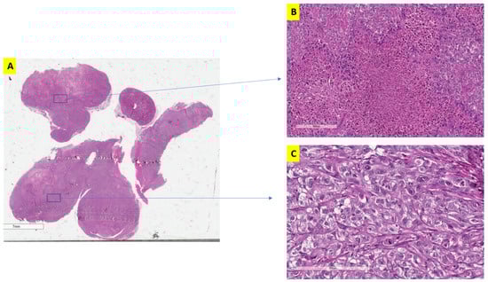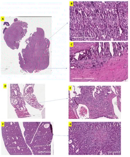 We compared the histomorphology of tumor xenografts subjected to the traditional treatment (Figure 3) and alternative treatment (Figure 4) at different time intervals. The traditional treatment showed early changes of aggressive behavior (Figure 3A) including greater extent of vasculature and spheroid formation, bizarre large nuclei and multi-nucleated cells (which indicates enrichment of stem-cell and EMT properties) (Figure 3B), irregular borders infiltrating into the surrounding tissue (Figure 3C), in agreement with our previous results showing early changes induced by sunitinib [18]. Mice from this group showed also remote metastatic lesions in lung (Figure 3D,E) and liver (Figure 3F,G).