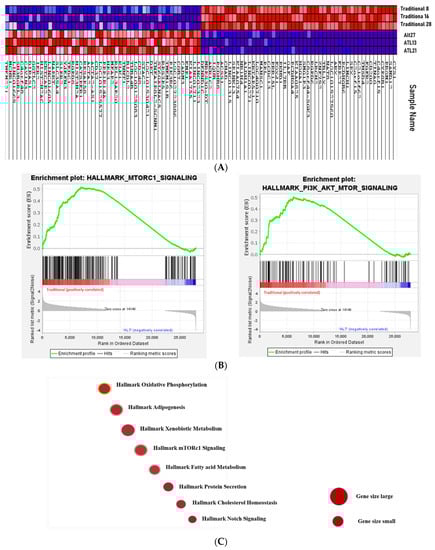 (A) Transcriptome profile comparison between the traditional and the alternative groups. The expression of a number of genes was significantly different between the two groups. Red = upregulated genes. Blue = downregulated genes; (B) mTOR signaling and PI3K/AKT pathways were significantly enriched in traditional; (C) significant enriched the signaling pathways in traditional treatment. The size of the circle denotes the relative number of genes in each pathway; (D) signaling enrichment analysis performed using Reactome analysis showed comparable pathways to the H collection analysis. It showed additionally that groups of these pathways form Reactome functional interaction networks, as indicated by the connecting lines.