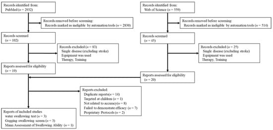 - Park, K.D.; Kim, T.H.; Lee, S.H. The Gugging Swallowing Screen in dysphagia screening for patients with stroke: A systematic review. Int. J. Nurs. Stud. 2020, 107, 103588. [Google Scholar] [CrossRef]