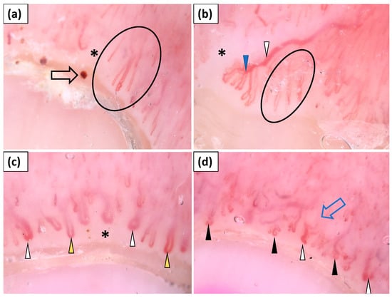 (a–d) Videodermoscopy of nailfold capillaries showed the presence of elongated capillaries (black circle), tortuous vessels (black arrowhead), “bushy capillaries” (blue arrowhead), dilated vessels (yellow arrowhead), giant capillaries (white arrowhead), hemorrhages (black arrow), avascular areas (black asterisk), and disorganized vessel architecture (blue arrow).