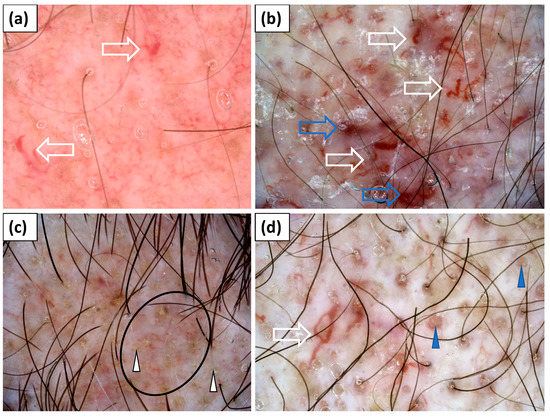 - Sławińska, M.; Sokołowska-Wojdyło, M.; Sobjanek, M.; Golińska, J.; Nowicki, R.; Rudnicka, L. The significance of dermoscopy and trichoscopy in differentiation of erythroderma due to various dermatological disorders. J. Eur. Acad. Dermatol. Venereol. 2021, 35, 230–240. [Google Scholar] [CrossRef] [PubMed]