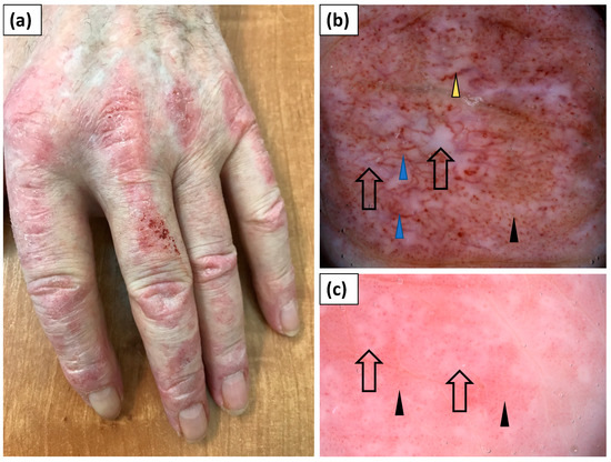 (a) Clinical presentation of erythematous papules and plaques over the metacarpophalangeal and interphalangeal joints (Gottron’s papules). (b) Videodermoscopy of Gottron’s papules showed irregularly distributed dotted (black arrowhead), linear vessels with branches (blue arrowhead), and linear curved vessels (yellow arrowhead) surrounding white structureless areas (black arrow). (c) Videodermoscopy of Gottron’s papules showing predominantly dotted vessels (black arrowhead) surrounding irregular pink structureless areas (black arrow).