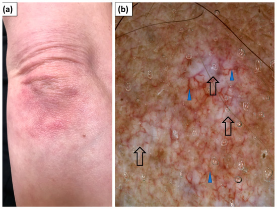 (a) Clinical presentation of Gottron’s sign over the elbow. (b) Videodermoscopy of Gottron’s sign showed irregularly distributed linear vessels with branches (blue arrowhead) and white structureless areas (black arrow).