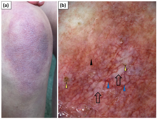(a) Clinical presentation of Gottron’s sign over the knee. (b) Videodermoscopy of Gottron’s sign showed irregularly distributed dotted (black arrowhead) and multiple linear vessels with branches (blue arrowhead) surrounding white structureless areas (black arrow). Follicular plugs (yellow arrowhead) were present as well.