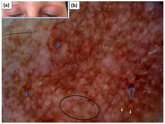 (a) Clinical presentation of heliotrope. (b) Videodermoscopy of heliotrope showed irregularly distributed linear vessels with branches (blue arrowhead), red hemorrhagic globules (blue arrow), grey dots (black circle), and yellowish globules (yellow arrowhead).