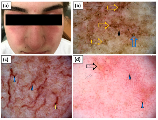 (a) Clinical presentation of erythematous lesions on the face. (b–d) Videodermoscopy of lesions on the face showed irregularly distributed linear vessels (black arrowhead), linear vessels with branches (blue arrowhead) and linear curved vessels (yellow arrowhead), yellow structureless areas (black arrow), follicular plugs (blue arrow), and stellate brown structures (yellow arrow).