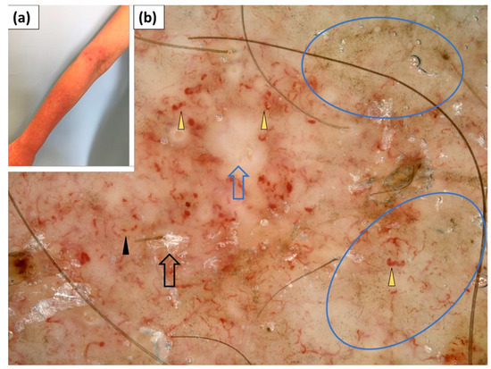 (a) Clinical presentation of erythematous lesions on the forearms. (b) Videodermoscopy of the lesions on the forearms showed irregularly distributed dotted vessels (black arrowhead) and linear curved vessels (yellow arrowhead), white patchy scales (black arrow), white structureless areas (blue arrow), and irregularly distributed brown-grey dots (blue circle).