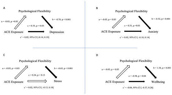 Mediation Analyses. Each quadrant represents a mediation analysis with ACE Exposure (ACE Questionnaire total) as a constant predictor variable with Psychological Flexibility (PsyFlex outcome) as a constant mediator variable. The outcomes change as follows: (A) Depression (DASS-21); (B) Anxiety (DASS-21); (C) Stress (DASS-21); and (D) Wellbeing (WEMWBS). Note: “c” refers to bivariate effect of predictor on outcome; “c’” refers to bivariate effect of predictor on outcome while controlling for the mediator. Arrows: hollow (white) arrows indicate a non-significant mediation effect, with filled (black) arrows indicating a significant relationship.