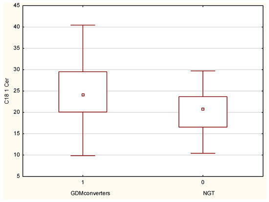 Available data report an association between an increased risk of diabetes development and higher C18:0-Cer levels in plasma [31]. Similarly, in our experiment, in the GDM group this parameter increased during pregnancy and, in the second trimester, was revealed to be significantly higher than in the NGT group where it stayed at a constant level.