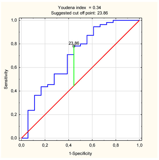 ROC curve for C18:1-Cer measured in the 1st trimester of pregnancy (AUC = 0.702 (95% confidence interval: 0.552–0.852; p = 0.008) with optimal cut-off value of 23.87 ng/mL).