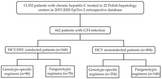 The patients included in the current analysis were selected from the EpiTer-2 database (of 13,552 patients treated for chronic hepatitis C in 2015–2020 (Figure 1), (http://www.pteilchz.org.pl/informacje/epiter-2/ assessed on 28 December 2021). This is an ongoing large retrospective multicenter national real-world study evaluating DAA-based antiviral treatment in individuals with chronic hepatitis C treated in 22 Polish hepatology centers. The selection of the antiviral regimen was made by the treating physicians based on the medical knowledge according to the national recommendations of the Polish Group of Experts for HCV and the principles of the reimbursed therapeutic program established by the National Health Fund (NHF) considering the potential drug–drug interactions with antiretroviral therapy (ART) [19]. Drug doses and treatment duration were consistent with the Summary of Product Characteristics.