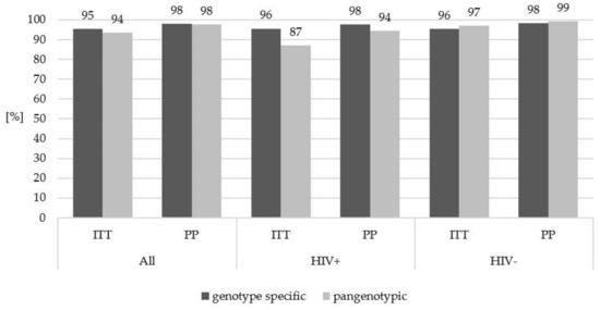 Treatment effectiveness following genotype-specific and pangenotypic regimens according to the HIV status.