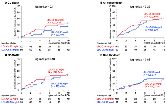 Cumulative cardiovascular event rates in groups divided by median LDL-C at procedure. Similar cumulative incidences of (A) CV death, (B) All-cause death, (C) 3P-MACE and (D) Non CV death in patients with and without LDL-C higher than median (>93 mg/dL). Percent indicates the cumulative incidence of events at 10 years of follow-up in each group.
