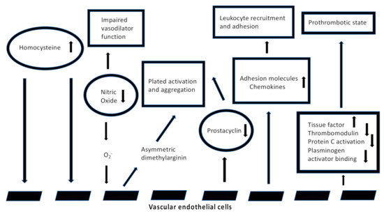 Hyperhomocysteinemia (HHcy) is an independent risk factor for cardiovascular, neurological and autoimmune diseases [1]. Homocysteine (Hcy) is a key metabolite involved in the biosynthesis and metabolism of methionine (Met). Although Hcy is not directly involved in protein synthesis, its role in folate and choline catabolism is fundamental in the regulation of Met activity and for the synthesis of several proteins. Hcy could be used to donate methyl groups, which is the base for the synthesis of methylated compounds, while inorganic sulfate is important for the synthesis of sulfur-containing amino acids (Figure 1) [2]. Blood sampling can be used to measure Hcy plasmatic levels. They can significantly vary individually, as follows: physiological levels are between 5 and 10 μmol/L, and levels above 10 μmol/L result in the condition of HHcy. HHcy is classified as “mild” if the levels range from 15 to 30 μmol/L, “intermediate” if they range from 30 to 100 μmol/L, and “severe” for values over 100 μmol/L [3]. Persistent HHcy is an established biomarker of increased cardiovascular risk in out-of-hospital patients; it promotes atherothrombotic events and increases inflammation, leading to vessel damage [4]. The main mechanism of cardiovascular risk by HHcy is pervasive endothelial dysfunction, engaging both small and large vessels. Both the reduction in endothelial vasodilator nitrogen monoxide (NO) and the increase in oxidative stress, due to the production of reactive oxygen species (ROS), are involved in this pathway [5]. Since ROS easily interacts with NO to form peroxynitrite (ONOO−), an aggressive oxidizing reactive molecule, thromboxane A2 (TxA2) synthesis, with subsequent arteriolar vasoconstriction, is raised [6]. Furthermore, Hcy promotes atherosclerotic lesions, activating the transcription of nuclear factor kappa-light-chain-enhancer of activated B cells (NF-κB), which increases the endothelial expression of monocyte chemoattractant protein-1 (MCP-1) and inflammatory cytokine production, such as interleukin-8 (IL-8) (Figure 2) [7].
