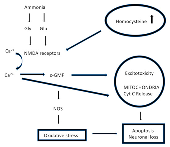 Recent evidence suggests that Hcy worsens acute brain injury (ABI) and other neurological conditions, such as post-stroke early neurological dementia (END), brain atrophy, Parkinson & Alzheimer disease and epilepsy, although its molecular mechanism in this role is not fully clarified [8]. First of all, ROS, in addition to its cardiovascular effects, negatively influences the brain, with the development of neuronal damage, and leads to neuronal cell death and brain atrophy. An increased ROS concentration promotes mitochondrial dysfunction through copper (Cu2+) chelation, which results in cytochrome C oxidase inactivation; cytochrome C is an enzyme for the ATP synthesis in the respiratory electron transport chain [9]. Moreover, Hcy is an amino acid with excitatory activity on N-methyl-D-aspartate glutamate receptors (NMDA), leading to a toxic condition called “excitotoxicity”, which is responsible for changes in the homeostasis of intracellular calcium (Ca2+) and the development of numerous neurological conditions [10]. Other pathways that associate HHcy effects to cell damage in the nervous system are related to the inflammatory response: Hcy is able to increase NF-kB expression and its activity in neuronal cells, as well as many pro-apoptotic markers, such as Bax, p53 and caspase-3 (Figure 3) [11].